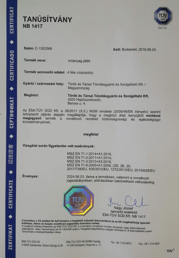 „A gyártónak kötelező a játék forgalomba hozatala előtt a játékkal kapcsolatos vegyi, fizikai, mechanikai, elektromos, gyúlékonysági, higiénikus és radioaktivitási veszélyekről elemzést készíteni, valamint felmérni az ezeknek való potenciális kitettség mértékét.” (https://net.jogtar.hu/jogszabaly?docid=a1100038.ngm)